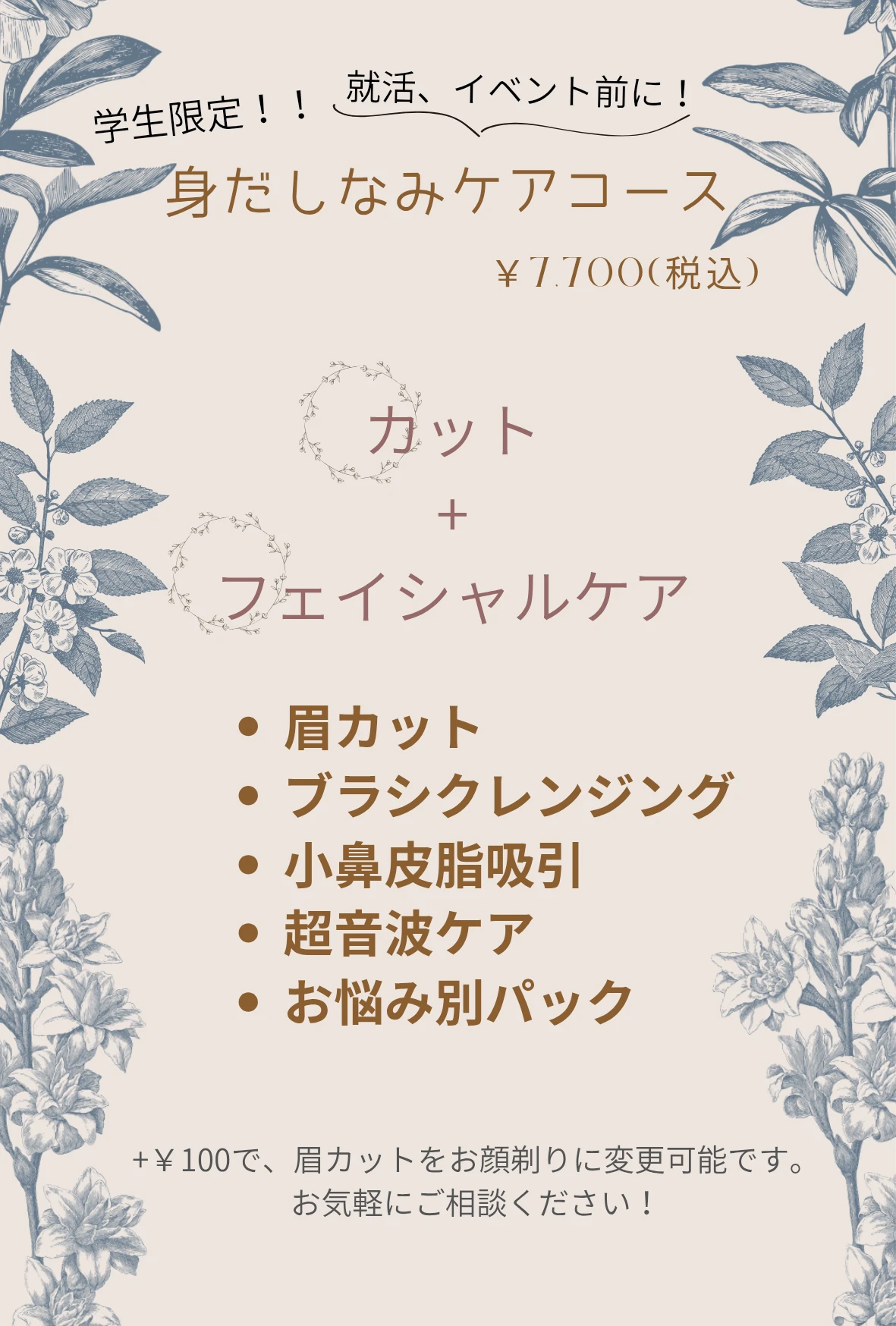 お顔剃りはついてきませんが、ご自身ではなかなか手入れが難しい眉カットにアロママッサージなどが付いたコースとなります。